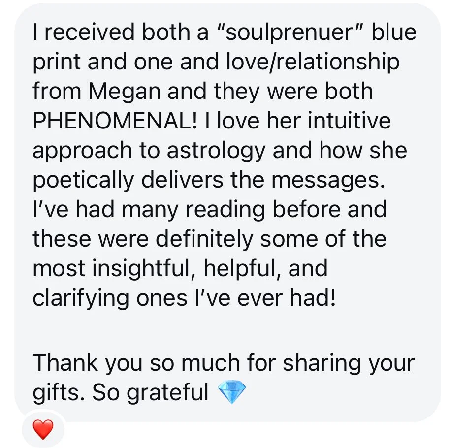 I received a Soulprenuer Blueprint and one of her love / relationship readings from Megan and they were both PHENOMINAL! I love her intuitive approach to astrology and how she poetically delivers the messages. I’ve had many readings before but these were definitely some of the most insightful, helpful, and clarifying ones I’ve ever had! Thank you so much for sharing your gifts. So grateful.